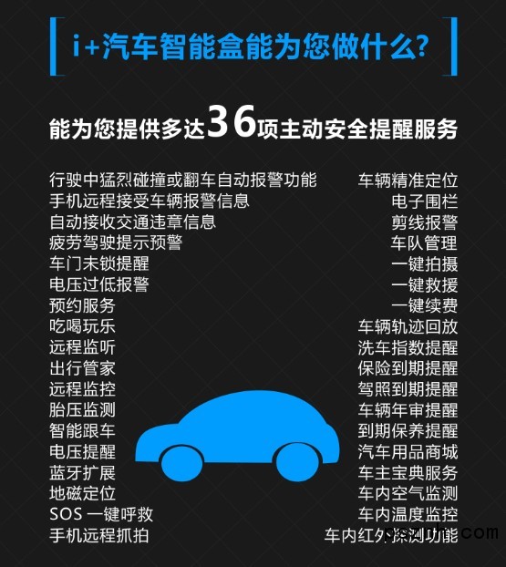 1、i+汽车智能盒是安装在车上的,由4S店公众号、4S店微 商城、4S店三级分销系统、软件操作系统、云数据交互平台等组成的产品。 2、彻底解决长期困扰4S店对车主服务准确性不高、黏性不强、客户流失的问题。 3、与车主长期建立良好的服务关系,与车主形成利益互动提供了强有力的支撑平台。 4、在活跃4S店的公众号同时,提升4S店等商家的知名度,汇聚了人气,稳定了老客户带来新客源。 i+汽车智能盒能为4S店做什么? A:i+汽车智能盒4S店或商家可以用免费方式获得,4S店或商家没有费用负担。 B:免费获得一个价值20,000元的专用三级微信营销系统一套。 C:极大活跃了4S店或商家公众号,与车主形成长期利益互动的平台。 D:向车主发送的36项安全提醒,都是4S店或商家公众号发出的,它能为4S店或商家带来: 1、提升4S店等商家品牌知名度。 2、为车主长期提供精准非维修和非车险服务。 3、极大培养了车主对4S店的依赖度和忠诚度。关于真正落地的车联网,360汽车智能车管家,汽车智能控制,汽车人工智能还有更多信息等你看哦
